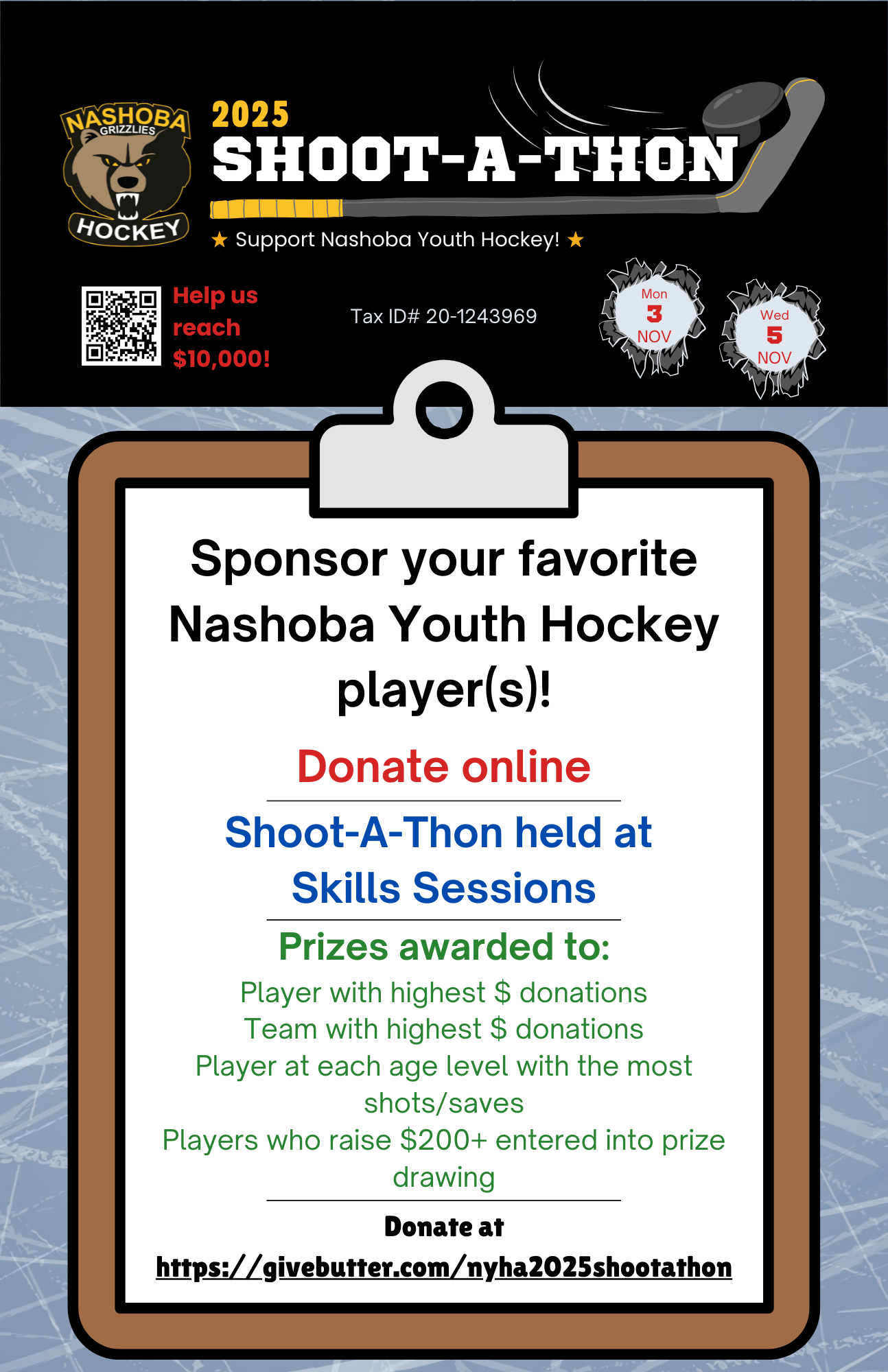 🫶 Your tax deductible donation supports our mission to make town hockey accessible to all children who want to play. Proceeds from this event benefit the Nashoba Youth Hockey Association and are used to fund many of our initiatives, such as goalie clinics, tuition assistance, scholarships, and our Play It Again equipment program.
