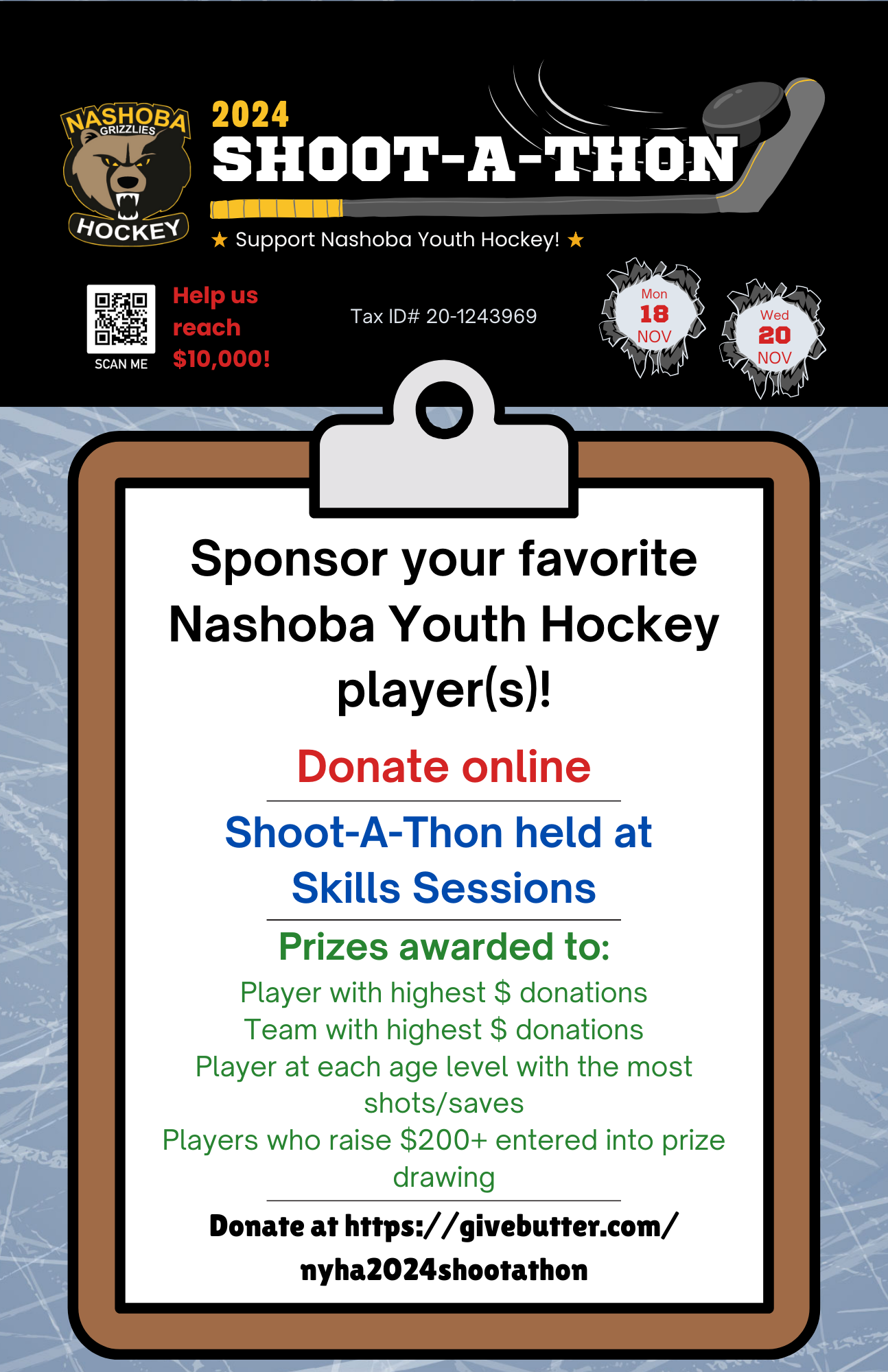 🫶 Your tax deductible donation supports our mission to make town hockey accessible to all children who want to play. Proceeds from this event benefit Nashoba Youth Hockey Association and are used to fund many of our initiatives, such as goalie clinics, tuition assistance, scholarships, and our Play It Again equipment program.