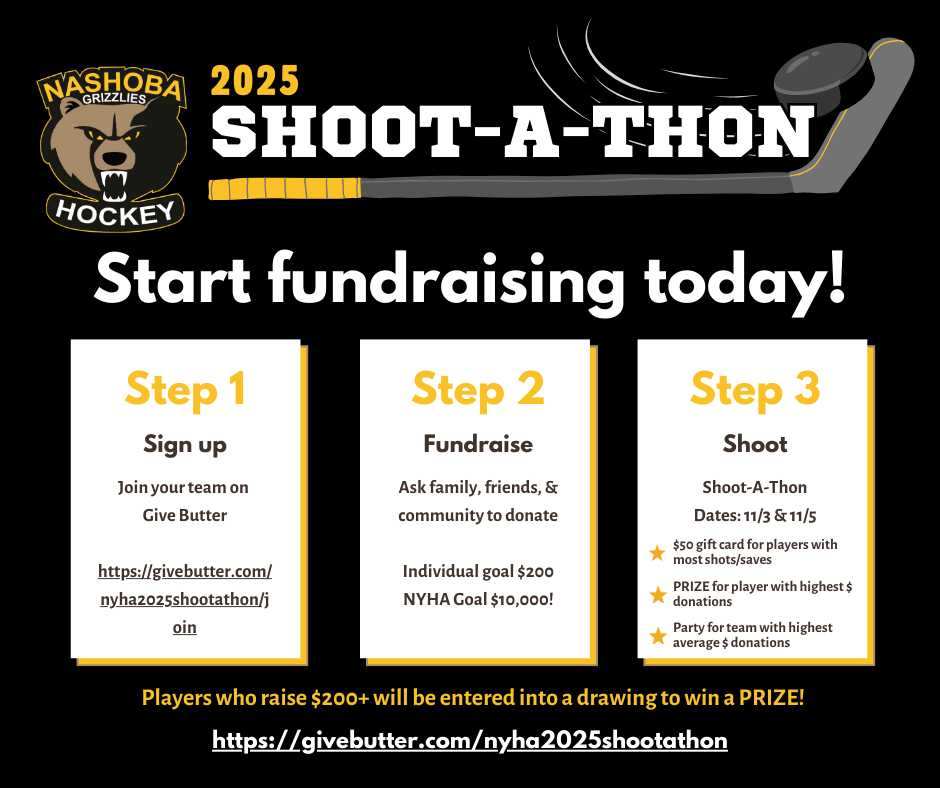 The Shoot-a-Thon is NYHA’s annual fundraiser where players raise donations to help support programs like goalie clinics, equipment, tuition assistance, and more.